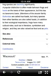A link at the end of the section headers (same font size, aligned with them, no arrow and no underline) leads to the View History page of the article in desktop view. By going back, the user will be returned to the mobile view.