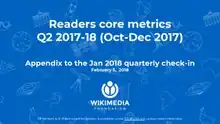 Regular Readership metrics reports were launched by the Wikimedia Foundation's Reading team in September 2015 (initially published weekly), providing a look at some of the most important metrics measuring readership of Wikimedia sites. Their main purpose is to raise awareness about how these metrics are developing, call out the impact of any unusual events in the covered timespan, and facilitate thinking about core metrics in general. The reports have been sent to Mobile-l and some other mailing lists, with PDF copies of past issues and other material from the reports also being available on Commons. Since 2016/17, this topic has been covered in a quarterly presentation on core metrics that grew out of the appendix to the Readers team's quarterly review/quarterly check-in meetings, which is still published on Commons (cf. examples from May 2017 or February 2017) and announced on mailing lists.