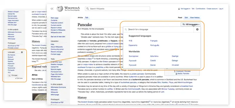 Over the past few months, the team has focused on improving the language switching functionality for our projects. Previously, the language links were available at the bottom of the sidebar menu and were difficult to find for readers and new editors. We have made a change that allows the language switching functionality to appear at the top of the page via a button. We have built this functionality based on the input of editors and readers from our prototype and other user testing.