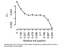 As mentioned above, the average article page has an overall click rate of 50%. So this page of categories did not have the click-through rate that a page has. However, this page had summaries of each of the pages, so it could be that users were generating value beyond what a blue link would provide. A live-user test of Gather collections, from whom this format was borrowed, suggested that the format used up too much vertical space on each article and was hard to flip through. Shortening the amount of text or image space might be something to try to make the page more useful.