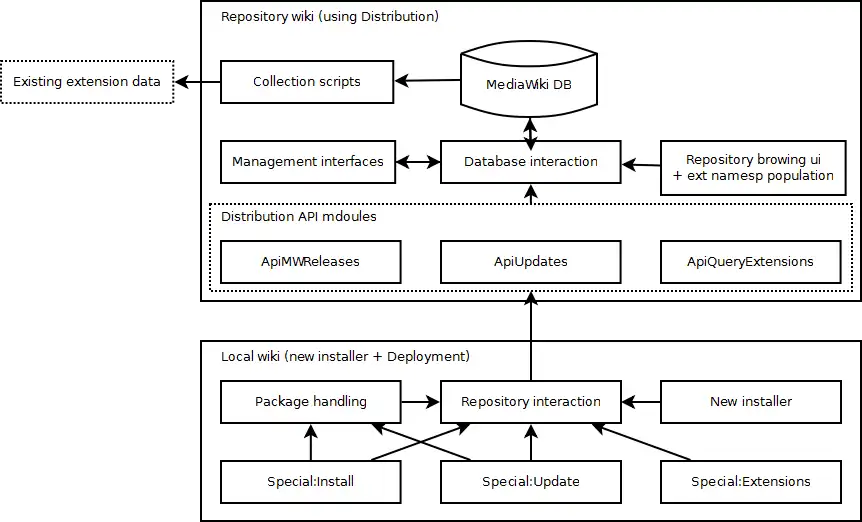 The Distribution extension will initially provide extension and core deployment metadata, and later on also create deployment packages. The Deployment extension enables installation and updating of extensions and MediaWiki itself. It obtains deployment packages by using the API provided by the Distribution extension, parses these and applies them. For this it provides several special pages.