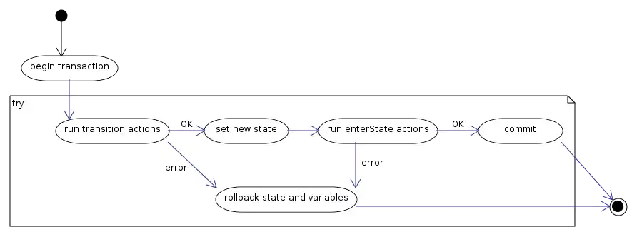 Each transition will be protected by a database transaction on the state variables, and any side-effects should be transactional as well. Library actions are responsible for guaranteeing that any side-effects are rolled back if the transition fails, even if it fails from another action. TODO: design the interface for actions with side-effects.