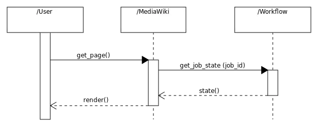 Workflow state can be loaded directly and used like an ordinary variable. Here, a page is rendered from templated wikitext or a SpecialPage, and state variables are pulled in to generate the page content. The job is retrieved by ID, and perhaps the ID or a token (if the job does not belong to the current user) are embedded in the rendered content or stored in the session, to facilitate further user interaction.