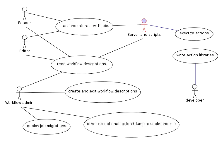 Workflows are captured as text, on-wiki in the Workflow: namespace, or on the filesystem. These text contents describe process models as network graphs, like the familiar state machine, plus some associated configuration constants. When one of these networks is executed, it waits for signal words, and may respond by making calls into a tightly restricted set of custom PHP helper libraries. Complex workflows should be broken down into a cohort of sub-networks.