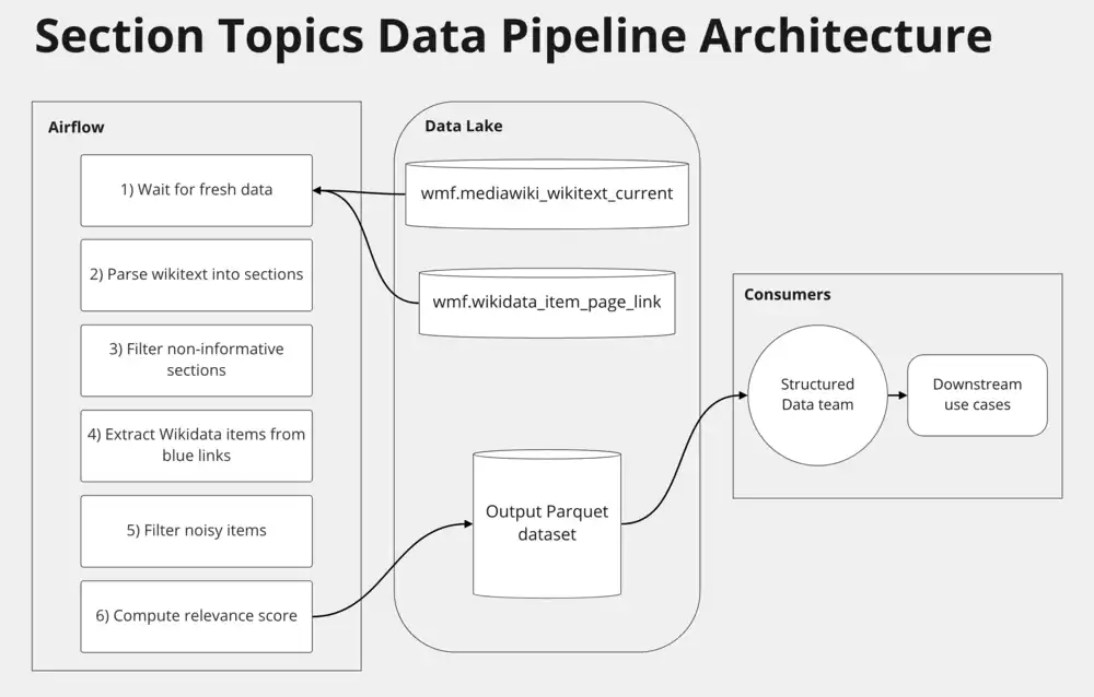 - one Python Spark task that takes as input Wikipedias wikitext, Wikidata item page links, and outputs the section topics dataset.