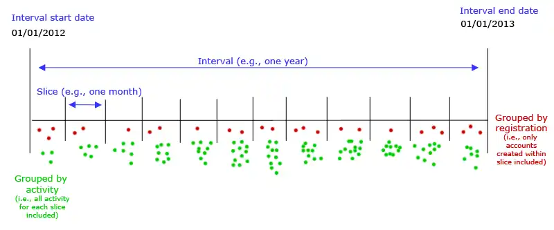 Each slice is identified by its start date (lines [27], [32], [37], [42]) and the data consists of the number of users who registered during that slice [28], the number of those users who reached the threshold [29] , and the proportion of users who successfully reached the threshold [30].