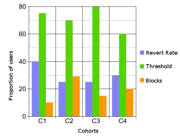 - revert rate: proportion of reverted edits within 24 hours of registration