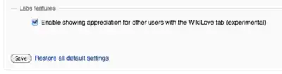 WikiLove is a feature designed to make it easy and fun to publicly express appreciation for other users. WikiLove can be invoked from any user page by clicking the "Heart" icon. It was originally developed by Ryan Kaldari as a user script, and is now available as a MediaWiki extension that developers can add to their wikis.