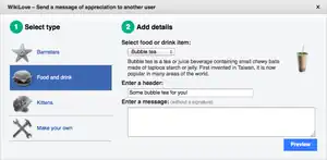The WikiLove interface can be tailored to suit the needs of each individual editor. If you want to use WikiLove for leaving welcome messages, birthday cakes, or hedgehogs, it's easy to override the default configuration with your own settings.
