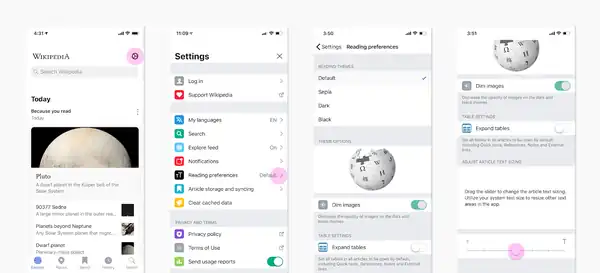 You can adjust the article text size using the Text Size tool from any article's toolbar. This setting affects the size of the text in articles, previews and summaries. To adjust the size of the user interface elements (like buttons) you can use iOS’s Dynamic Text setting, which will adjust the size of interface text across your device, including on Wikipedia.