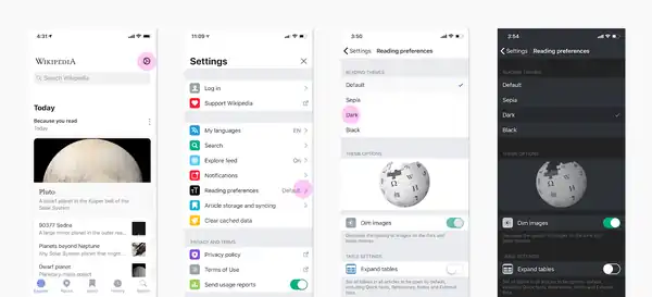 You can select the color palette for text and background, and also apply dimming to images in the Reading preferences screen of Settings. We don’t currently support automatic night mode directly in the app’s settings, but we do have both a Dark and Black palette which make great low-light reading options. We also support the dimming of images to reduce brightness of images throughout the app.
