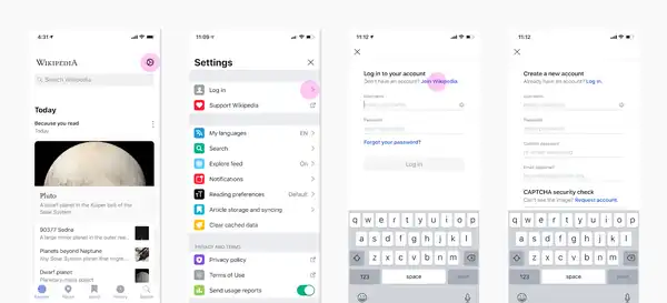 On the app’s Settings screen, the first menu item is Log In. Tap that option and then select the blue Join Wikipedia link on the log-in screen to create an account.