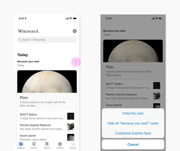 You can remove article recommendations from Explore by tapping the “…” icon and tapping Hide this card. To remove all recommendations based on your reading history, tap the “...” icon and select the Hide all Because you read Recommendations. You can also customize the Explore feed content from the Settings menu’s Explore feed screen.