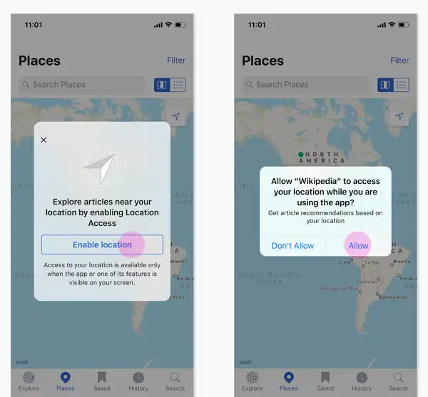 When you tap Places, the app requests access to use the location of your device so we can determine your location using Apple's standard access methods. If users allow location access, we query Wikipedia for a list of articles that are nearby the current location. This is in no way associated with your account. The iOS application itself also does not store your location.