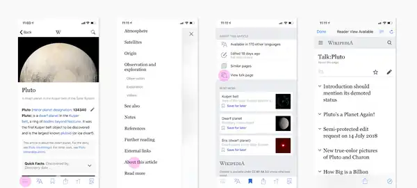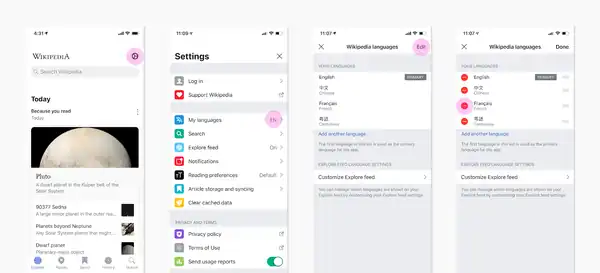 Both apps present information from various languages in a card-based feed we call Explore. This is because mobile apps do not present content on small phones in the "web page template" style that websites do. So we take the content from those main pages that volunteers own and create, and we present that as cards in an easily scrollable and customizable feed.