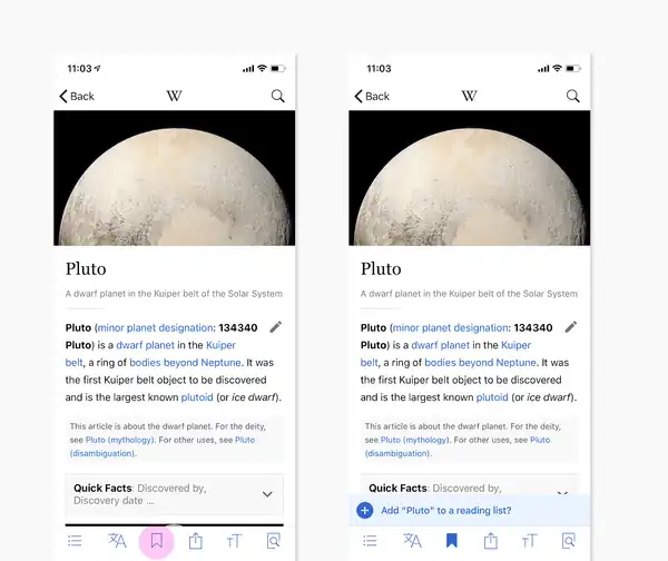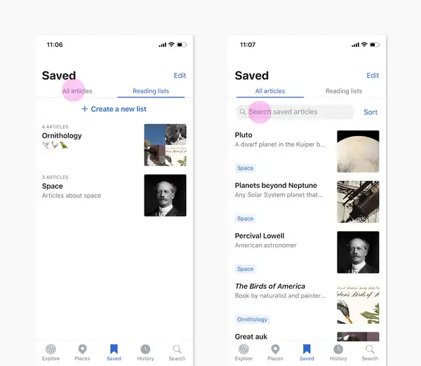 When saving an article, a shortcut appears at the bottom of the screen. Tap the shortcut to create and organize saved pages into reading lists.