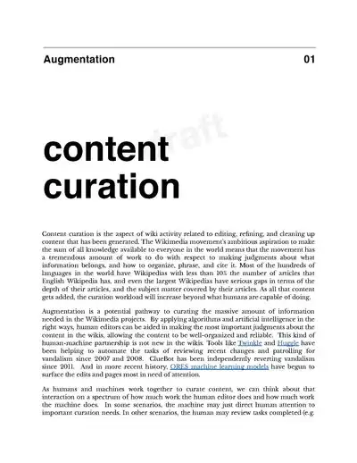 Augmentation is a potential pathway to curating the massive amount of information needed in the Wikimedia projects. By applying algorithms and artificial intelligence in the right ways, human editors can be aided in making the most important judgments about the content in the wikis, allowing the content to be well-organized and reliable. This kind of human-machine partnership is not new in the wikis. Tools like Twinkle and Huggle have been helping to automate the tasks of reviewing recent changes and patrolling for vandalism since 2007 and 2008. ClueBot has been independently reverting vandalism since 2011. And in more recent history, ORES machine learning models have begun to surface the edits and pages most in need of attention.