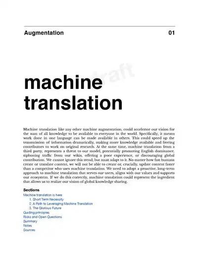 Machine translation like any other machine augmentation, could accelerate our vision for the sum of all knowledge to be available to everyone in the world. Specifically, it means work done in one language can be made available in others. This could speed up the transmission of information dramatically, making more knowledge available and freeing contributors to work on original research. At the same time, machine translation from a third party, represents a threat to our model, potentially promoting English dominance, siphoning traffic from our wikis, offering a poor experience, or discouraging global contribution. We cannot ignore this trend, but must adapt to it. No matter how fast humans create or translate content, we will not be able to create or, crucially, update content faster than a competitor who uses machine translation. We need to adopt a proactive, long-term approach to machine translation that serves our users, aligns with our values and supports our ecosystem. If we do this correctly, machine translation could represent the ingredient that allows us to realize our vision of global knowledge sharing.