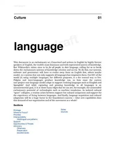 This document is an exclusionary act. Conceived and written in English by highly literate speakers of English, the world’s most dominant and well-represented system of knowledge. But Wikimedia's vision aims to be for all people, in their language, calling for us to break down the exclusionary systems of knowledge creation and access. To do this, our systems, software and governance will have to evolve away from an English first, others maybe model, to a system that not only supports all languages but empowers them. For 60% of the world [1] using multiple languages, for different purposes, is a the normal way to live. Pidgins and inter-languages produce knowledge too, so how must the current one-project-one-language model adapt to support evolving languages such as Hinglish and Spanglish? And while capturing and growing knowledge in all languages is an uncontroversial goal, it is at these fuzzy edges that we can see, for example, the unintended exclusionary potential of technologies such as machine translation. As isolated cultural “space” collapses, a tension arises between support for cultural uniqueness and support for the experience of living between languages. And finally, language acquisition and cultural adaptation will be a huge factor in the foundation’s success – what new capabilities does this demand of our organization and of the movement as a whole?
