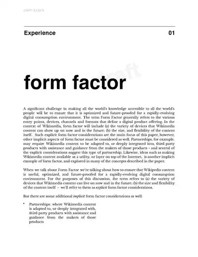 The term Form Factor generally refers to the various entry points, devices, channels and formats that define a digital product offering. In the context of Wikimedia, form factor will include (a) the variety of devices that Wikimedia content can show up on now and in the future; (b) the size, and flexibility of the content itself. Such explicit form factor considerations are the main focus of this paper, however, other implicit aspects of form factor must be considered as well. Partnerships, for example, may require Wikimedia content to be adapted to, or deeply integrated into, third party products with assistance and guidance from the makers of those products - and several of the explicit considerations suggest this type of partnership. Likewise, ideas like making Wikimedia content available as a utility, or layer on top of the Internet, are another implicit example of form factor explored in some of the concepts described in the paper.