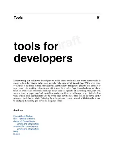 This paper advocates for building a platform that can support tools which work on all our wikis seamlessly. Right now a lot of developer code lives on the wikis (gadgets, Lua modules, templates) where it really isn’t possible to do any type of testing, code reviews or debugging; nor is there any straightforward way to add localization or RTL support. This often leads to issues like security vulnerabilities,[1] conflicts with MediaWiki deployed extensions,[2] and bugs due to lack of maintenance. Also, in its current state, having code hosted on the wikis (in a per-project fashion) makes it hard to get in the mindset of having the code work across wikis. It’s easy to get sucked into customization and forget to think about things like RTL rendering or localization.