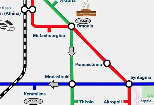 from Kerameikos metro station (Line 3 of Athens Metro- Blue Line) towards Airport / Doukisis Plakentias ⇒ Syntagma metro station