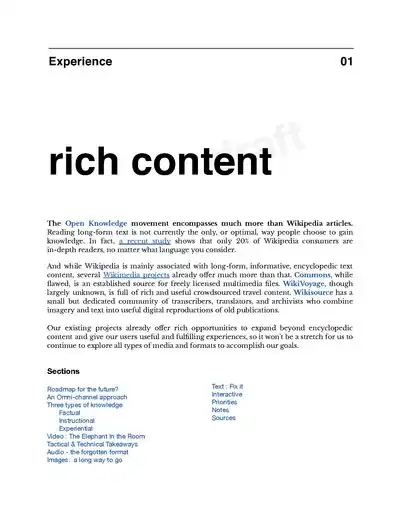 The Open Knowledge [1] movement encompasses much more than Wikipedia articles. Most of the world doesn’t know what “Wikimedia” is - they only know Wikipedia, and associate it with long-form, informative, encyclopedic text content. But we already offer much more than that. Commons[2], although flawed, is an established source for freely licensed multimedia files. WikiVoyage,[3] although largely unknown, is full of rich and useful crowdsourced travel content. Wikisource[4] has a small but dedicated community of transcribers, translators, and archivists who combine imagery and text into useful digital reproductions of old publications.