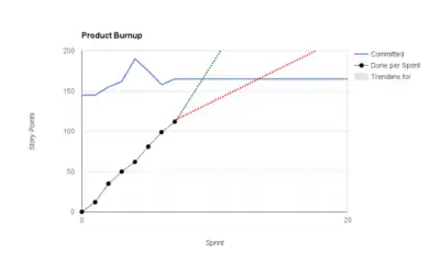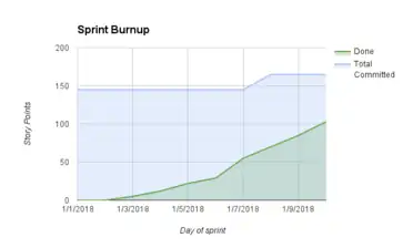 A modification of the Sprint Burndown chart. Instead of showing one line representing the total remaining points to be completed (i.e., Committed - Done), a burnup chart shows completed points over time (Done) with one line and Committed with a separate line. This makes it possible to see which changes in (Committed - Done) are due to changes in each of the two variables separated.