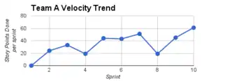 A chart showing how a team's #Velocity per #Sprint has changed over time. It can be used to diagnose trends in team performance.