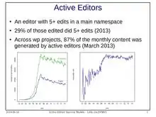 Slides. - by Leila Zia -- I will talk about first results in building prediction models for active editors' survival. A sample of such prediction models, their performance, and the important variables in predicting survival will be presented.