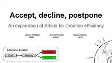 - by Aaron Halfaker -- A brief overview of research examining trends in newcomer article creation across 10 languages with a focus on English and German Wikipedias. In wikis where anonymous users can create articles, their articles are less likely to be deleted than articles created by newly registered editors. An in-depth analysis of Articles for Creation (AfC) suggests that while AfC's process seems to result in the publication of high quality articles, it also dramatically reduces the rate at which good new articles are published. (slides, read more)