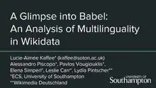 - ↑ Kaffee, Lucie-Aimée, et al. "A Glimpse into Babel: An Analysis of Multilinguality in Wikidata." Proceedings of the 13th International Symposium on Open Collaboration. ACM, 2017. https://eprints.soton.ac.uk/413433/1/Open_Sym_Short_Paper_Wikidata_Multilingual.pdf