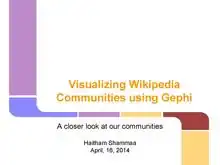 - by Haitham Shammaa -- I will introduce Gephi as a tool for generating a visualized representation of Wikimedia projects communities. Gephi is an open-source network analysis and visualization software, and is utilized to generate graphs that represent users and the interaction among them based on the frequency they send messages to each other on their talk pages.