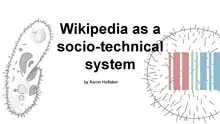 - By Aaron Halfaker: Wikipedia is a socio-technical system. In this presentation, I'll explain how the integration of human collective behavior ("social") and information technology ("technical") has lead to phenomena that, while being massively productive, is poorly understood due to lack of precedence. Based on my work in this area, I'll describe five critical functions that healthy, Wikipedia-like socio-technical systems must serve in order to continue to function: allocation, regulation, quality control, community management and reflection. Finally, I'll conclude with an overview of three classes of new projects that should provide critical opportunities to both practically and academically understand the maintenance of Wikipedia's socio-technical fitness.