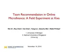 - In the second part of the talk, I will discuss a randomized field experiment we did in May 2014, when we recommend teams to lenders on Kiva. We find that lenders are more likely to join teams in their local area. However, after joining teams, those who join popular teams (on the leaderboard) are more active in lending.
