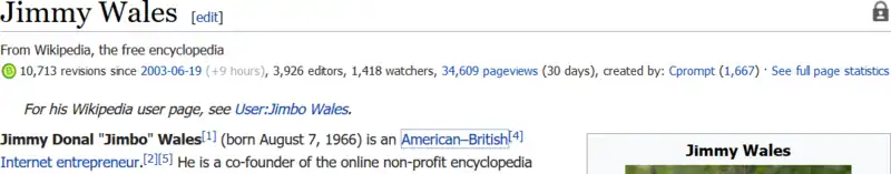 The XTools ArticleInfo gadget, as seen when viewing the English Wikipedia article on Jimmy Wales.