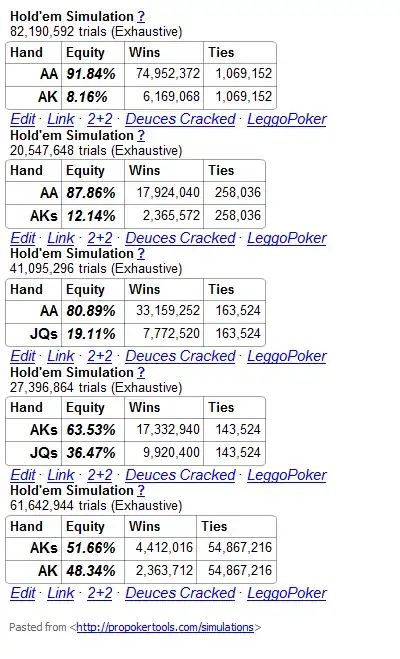 The fact we can calculate the odds of winning hands against these particular ranges [4:1 and 3:2 respectively], doesn't give us enough information to calculate the answer to the question.