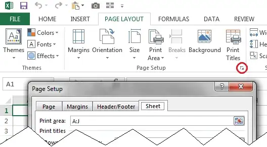 This may also be accessible as "Page Layout" → "Page Setup" → (corner button) → "Page Setup" → "Sheet":