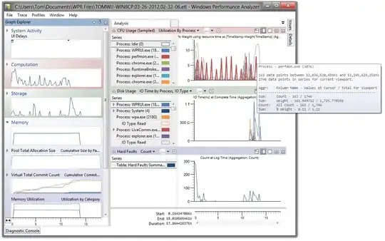 Note the yellow and blue bar. Anything before the yellow bar are considered to be the keys of that row, it is used as the series for the graph. The values between the yellow and blue bar are aggregated (usually summed), because its not just about a process but rather about the stacks the threads of the process walked. Then last, you can graph columns and give them a color. If you drag a start time and an end time here, it will even change the graph to show horizontal bars (to show when things started and stopped)...