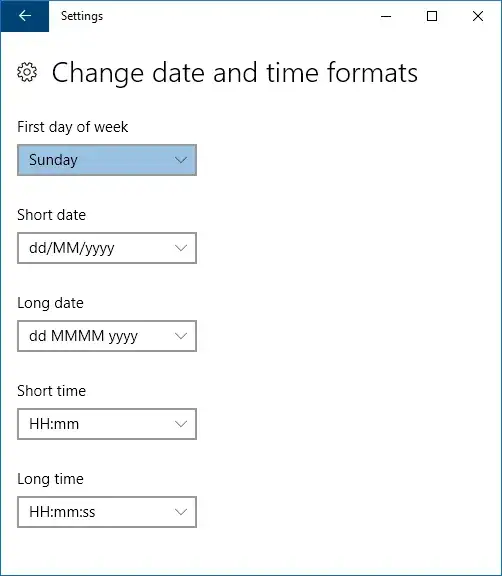 Formatssection, where there is a display-only summary of options, includingFirst day of week. Click the linkChange date and time FormatsOn the dialog that now appears, you can choose what one you want on the