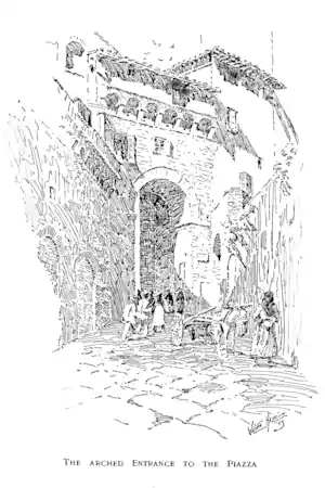 Apart from the joy of speculation, there was the beauty of the piazza itself. It is not every one whose summer-hotel windows look into a flat-iron square that has not changed one whit in four hundred years. There was a well near the point of the iron, with deep grooves worn in the stone sides from the ropes of centuries—that was the village club, and the sole ornament of the gravelled open space. Tall buildings, purely mediæval, defined the flat-iron; they had once been palaces, though the occupants probably stabled their horses on the ground floor in those days, as they do now. At our left, from a balcony as gay as sedate geraniums will permit, rose the Cortese tower, and across the square by the archway was the rugged monument of hate of the Cinatti—names that convey nothing to the dilettante in historical research, save a complacent satisfaction in the knowing of them. However, at right angles with the hotel, flanking the drug and tobacco shop, were the two low towers of the Ardinghelli, the Guelphs who began it all, and, farther on, beyond the church, were the two tall towers of the Ghibelline Salvucci, who outdid their neighbors by many feet, and lashed their opponents into a stone-mason's boom. It was not until we had drunk our chocolate and devoured seven biscuits at the café on the corner that we learned our own hotel to be part of the ancient Palazzo del Podesta (the home of the Mayor, we would say), whose campanile, with the clock on one side, became the measure for all extravagant excrescences. From that hour we viewed the results of this ancient rivalry in a different light, and with some degree of anxiety whenever we came upon a new one of unusual height. At various angles of the hilly town our tower was undoubtedly squat; in other spots it soared beautifully, and in one charming locality by the penitentiary it was higher even than the Torre del Comune, which is on a hill and has every advantage, as well as being an official tower and privileged to grow as tall as it pleased.