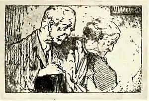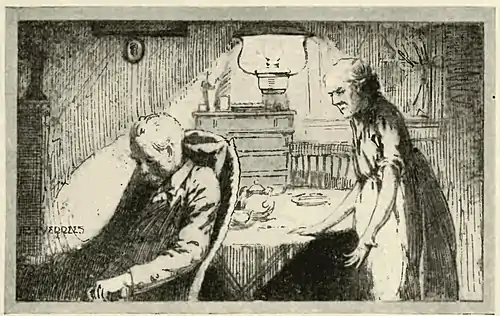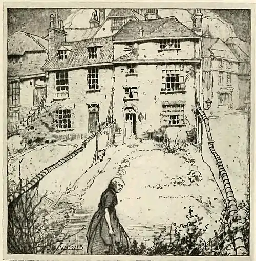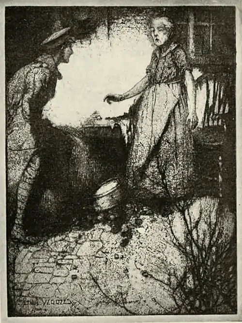 My next vision of Mrs, Ward concerns a certain winter evening. I could not see inside the kitchen, but the old man could be heard complaining. His querulous voice was rambling on, and Mrs. Ward was standing by the door leading into the garden. She had returned from her day's work, and was scraping a pan out into a bin near the door. A train shrieked by, and the wind was blowing a fine rain against the house. Suddenly she stood up and looked up at the sky; then she pushed back her hair from her brow, and frowned at the dark house next door; then she turned and said: