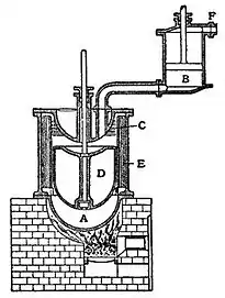 Fig. 1 —Stirling’s Air-Engine.The essential parts of one form of Stirling’s engine are shown in fig. 1. There A is the externally fired heating vessel, the lower part of which contains hot air which is taking in heat from the furnace beneath. A pipe from the top of A leads to the working cylinder (B). At the top of A is a cooler (C) consisting of pipes through which cold water is made to circulate. In A there is a displacer (D) which is connected (by parts not shown) with the piston in such a manner that it moves down when the piston has moved up. The air-pressure is practically the same above and below D, for these spaces are in free communication with one another through the regenerator (E), which is an annular space stacked loosely with wire-gauze. When D moves down, the hot air is driven up through the regenerator to the upper part of the containing vessel. It deposits its heat in the wire-gauze, becoming lowered in temperature and consequently reduced in pressure. The piston (B) descends, and the air, now in contact with the cooling pipes (C), gives up heat to them. Then the displacer (D) is raised. The air passes down through its regenerator, picking up the heat deposited there, and thereby having its temperature restored and its pressure raised. It then takes in heat from the furnace, expanding in volume and forcing the piston (B) to rise, which completes the cycle. The engine was double-acting, another heating vessel like A being connected with the upper end of the working cylinder at F. The stages at which heat is taken from the furnace and rejected to the cooler (C) are approximately isothermal at the upper and lower limits of temperature respectively, and the cycle accordingly is approximately “perfect” in the thermodynamic sense. The theoretical indicator diagram is made up of two isothermal lines for the taking in and rejection of heat, and two lines of constant volume for the two passages through the regenerator. This engine was the subject of two patents (by R. and S. Stirling) in 1827 and 1840. A double-acting Stirling engine of 50 horse-power, using air which was maintained by a pump at a fairly high pressure throughout the operations, was used for some years in the Dundee Foundry, where it is credited with having consumed only 1.7 ℔ of coal per hour per indicated horse-power. The coal consumption per brake-horse-power was no doubt much greater. It was finally abandoned on account of the failure of the heating vessels.
