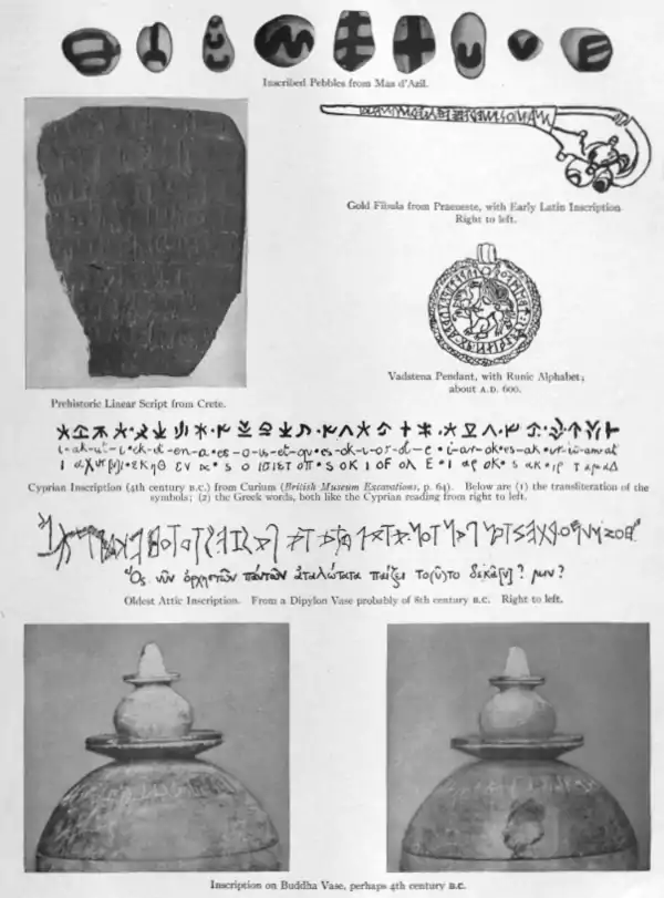 Authorities.—Owing to the rapid increase of materials, all early works are out of date. The best general accounts, though already somewhat antiquated, are: (1) The Alphabet (2 vols., with references to earlier works), by Canon Isaac Taylor (1883), reprinted from the stereotyped plates with small necessary corrections (1899); and (2) Histoire de l’écriture dans l’antiquité, by M. Philippe Berger (Paris, 1891, 2nd ed. 1892). An excellent popular account is The Story of the Alphabet, by E. Clodd (no date, about 1900). Faulmann’s Illustrierte Geschichte der Schrift (1880) is a popular work with good illustrations. For the beginnings of the alphabet, Dr A. J. Evans’s Scripta Minoa (vol. i., 1909) is indispensable, whether his theories hold their ground or not. The Semitic alphabet is excellently treated by Lidzbarski in the Jewish Encyclopaedia (1901); his Nordsemitische Epigraphik (1898) has excellent facsimiles and tables of the alphabets, and there are many contributions to the history of the alphabet in the same writer’s Ephemeris für semitische Epigraphik (Giessen, since 1900). See also “Writing” (by A. A. Bevan) in the Encyclopaedia Biblica, and “Alphabet” (by Isaac Taylor) in Hastings’ Dictionary of the Bible. A very good article, now somewhat antiquated, is Schlottmann’s “Schrift und Schriftzeichen” in Riehm’s Handwörterbuch des biblischen Altertums (1884, reprinted 1894). For Greek epigraphy the fullest and also most recent work is W. Larfeld’s Handbuch der griechischen Epigraphik (vol. ii., 1902; vol. i., 1907) (see especially Herkunft und Alter des griechischen Alphabets, i. 330 ff.). For the history of the Greek alphabet the fundamental work was A. Kirchhoff’s Studien zur Geschichte des griechischen Alphabets (4th ed., 1887): his theories were adopted and worked out on a much larger scale in E. S. Roberts’s Introduction to Greek Epigraphy, pt. i. “The Archaic Inscriptions and the Greek Alphabet” (1887), pt. ii. (with E. A. Gardner) “The Inscriptions of Attica” (1905). See also Salomon Reinach’s Traité d’épigraphie grecque (1885). in Iwan von Müller’s Handbuch der klassischen Altertumswissenschaft important articles on both Greek and Latin epigraphy and alphabets have appeared (Greek in edition 1 by G. Heinrichs, 1886; in edition 2 by W. Larfeld, 1892; Latin by Emil Hübner). See also “Alphabet,” by W. Deecke, in Baumeister’s Denkmäler des klassischen Altertums (1884), and by Szanto (Greek) and Joh. Schmidt (Italic) in Pauly’s Realencyclopädie edited by Wissowa (1894). Mommsen’s Die unteritalischen Dialekte (1850) is not without value even now. Other literature and references to fuller bibliographies in separate departments have been given in the notes. Elsewhere in this edition of the Encyclopaedia Britannica the articles on the various languages and under the headings Inscriptions, Palaeography, Writing, &c., should be consulted, while separate articles are given on each letter of the English alphabet. The writer is indebted to Dr A. J. Evans for a photograph of the Cretan linear script, and to Professors A. A. Bevan and Rapson of Cambridge, and to Mr F. W. Thomas, librarian of the India Office, for help in their respective departments of Semitic and Indian languages. (P. Gi.)