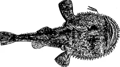 ANGLER, also sometimes called fishing-frog, frog-fish, sea-devil (Lophius piscatorius), a fish well known off the coasts of Great Britain and Europe generally, the grotesque shape of its body and its singular habits having attracted the attention of naturalists of all ages. To the North Sea fishermen this fish is known as the “monk,” a name which more properly belongs to Rhina squatina, a fish allied to the skates. Its head is of enormous size, broad, flat and depressed, the remainder of the body appearing merely like an appendage.