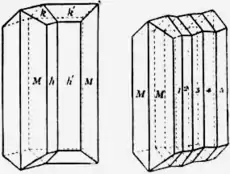 ARAGONITE, one of the mineral forms of calcium carbonate (CaCO3), the other form being the more common mineral calcite. It crystallizes in the orthorhombic system, and the crystals are either prismatic or acicular in habit. Simple crystals are, however, rare; twinning on the prism planes (M in the figures) being a characteristic feature of the mineral (fig. 1). This twinning is usually often repeated on the same plane (fig. 2), and gives rise to striations on the terminal faces (k) of the crystals; often, also, three crystals are twinned together on two of the prism planes of one of them, producing an apparently hexagonal prism. The mineral is colourless, white or yellowish, transparent or translucent, has a vitreous lustre, and, in fact, is not unlike calcite in general appearance. It may, however, always be readily distinguished from calcite by the absence of any marked cleavage, and by its greater hardness (H. = 312–4) and specific gravity (2·93); further, it is optically biaxial, whilst calcite is uniaxial. It is brittle and has a subconchoidal fracture; on a fractured surface the lustre is decidedly resinous in character.