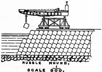 1. Rubble and Concrete-Block Mound Breakwaters.—A rubble mound consists merely of a mass of rubble stone, just as it is obtained from a neighbouring quarry, tipped into the sea along a predetermined line, till the mound emerges out of water. The rubble stone is deposited, either from barges, as Rubble mound.adopted for the construction of the detached breakwater sheltering Plymouth Bay, or from wagons, having hinged opening flaps at the bottom for dropping their load, run out from the shore along staging erected in the proposed line, according to the method employed for the outer breakwater enclosing Portland Harbour, and the north-east breakwater at Colombo Harbour. The mound thus deposited is gradually consolidated under the action of the sea; and a tolerably stable form is by degrees attained by continued deposits of stone. This system of construction is very wasteful of materials, and can only be resorted to where extensive quarries close at hand are able to furnish readily and cheaply very large quantities of stone, especially where, as at Portland and Table Bay, convict labour has been advantageously utilized in quarrying. When the site is very exposed, the large waves in storms, dashing over a rubble-mound breakwater, carry the stones on the top, if unprotected, over on to the harbour slope, and in recoiling down the outer slope, draw down the stones on the face, so that the top and sea slope of the mound need replenishing with a fresh deposit of stones after severe storms.