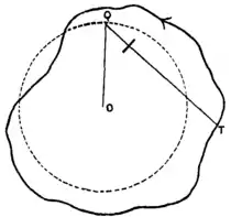To use Amsler’s planimeter, place the pole O on the paper outside the figure to be measured. Then the area generated by QT is that of the figure, because the point Q moves on an arc of a circle to and fro enclosing no area. At the same time the rod comes back without making a complete rotation. We have therefore in formula (1), α = 0; and hence