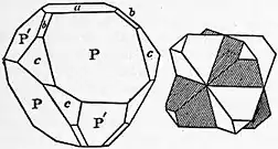 Fig. 1.Fig. 2. are bright and smooth. The combination of these two forms produces a figure resembling an octahedron, the angle between P and P′ being 70° 712′, corresponding to the angle 70° 32′ of the regular octahedron. The other faces shown in fig. 1 are the basal pinacoid, a {001}, and two square pyramids, b {101} and c {201}. Crystals are usually twinned, and are often complex and difficult to decipher. There are three twin-laws, the twin-planes being (111), (101) and (110) respectively. Twinning according to the first law is effected by rotation about an axis normal to the sphenoidal face (111), the resulting form resembling the twins of blende and spinel. Twinning according to the second law can only be explained by reflection across the plane (101), not by rotation about an axis; chalcopyrite affords an excellent example of this comparatively rare type of symmetric twinning. Interpenetration twins (fig. 2) with (110) as twin-plane are of very rare occurrence.