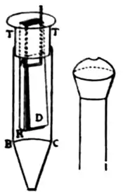 The arrangement of the free reed in an organ pipe is simple, and does not differ greatly from that of the beating reed shown in fig. 2 for the purpose of comparison. The reed-box, a rectangular wooden pipe, is closed at the bottom and covered on one face with a thin plate of copper having a rectangular slit over which is fixed the thin metal vibrating tongue or reed as described above. The reed-box, itself open at the top, is enclosed in a feed pipe having a conical foot pierced with a small hole through which the air current is forced by the action of the bellows. The impact of the incoming compressed air against the reed tongue sets it swinging through the slit, thus causing a disturbance or series of pulsations within the reed-box. The air then finds an escape through the resonating medium of a pipe fitting over the reed-box and terminating in an inverted cone covered with a cap in the top of which is pierced a small hole or vent. The quality of tone of free reeds is due to the tendency of air set in periodic pulsations to divide into aliquot vibrations or loops, producing the phenomenon known as harmonic overtones or upper partials, which may, in the highly composite clang of free reeds, be discerned as far as the 16th or 20th of the series. The more intermittent and interrupted the air current becomes, the greater the number of the upper partials produced.[3] The power of the overtones and their relation to the fundamental note depend greatly upon the form of the tongue, its position and the amount of the clearance left as it swings through the aperture.